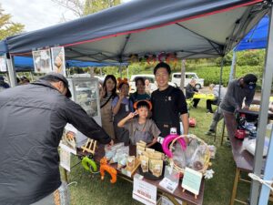 焼きそば、もつ煮、フランクフルト、唐揚げ、ポップコーン、金魚・メダカすくい、野菜販売など、支部ごとに特色ある模擬店を出店。赤堀支部が初出店したスイーツの模擬店では、かわいい「こども店長」の姿に、お客も笑顔に。シュークリームやチーズケーキ、クッキーなどが売れました。来場者は「作りたてで、おいししい」「新鮮野菜をたくさん買いました」などと話しながら、次々と店を回りました。近所の親子連れや外国人の姿も多く見られ、老若男女、多国籍な交流の場になりました。地域の人気バンド「かざぐるま」の演奏に、客席から踊り出す人も。